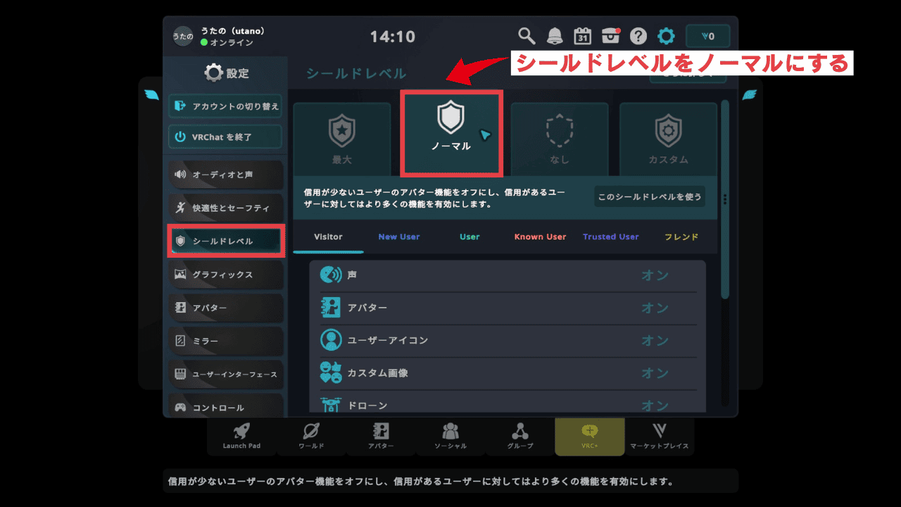 「シールドレベル」は、他ユーザーのアバターや音声などをどの程度表示するかを設定できる機能です。