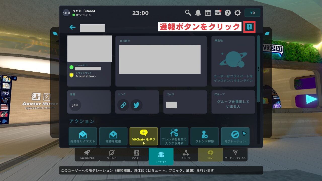 相手の行動がVRChatのコミュニティガイドラインに違反していると思われる場合は、通報機能を利用します。悪質な行為は運営に報告することで、他のユーザーが被害に遭うのを防ぐことにも繋がります。