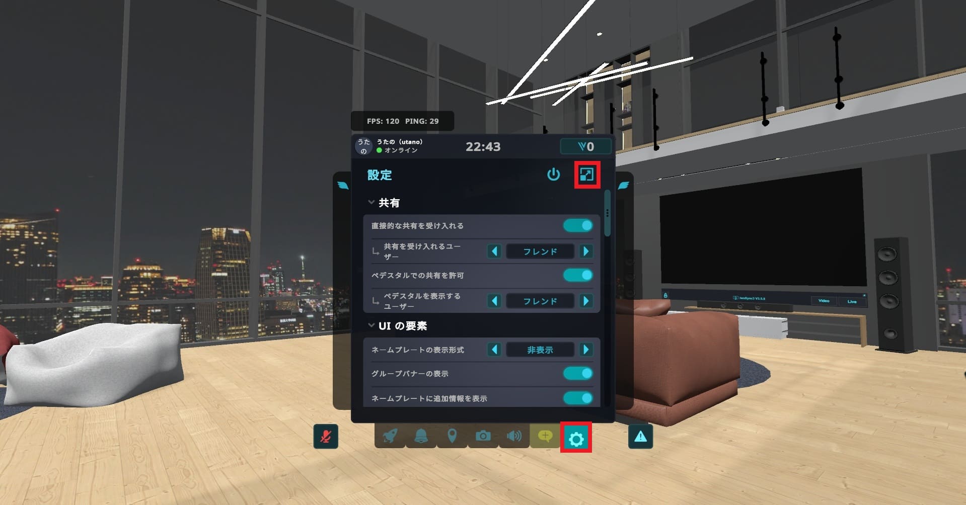 ①Launch Padを開いて(PCはEscキー、VRはコントローラのメニューボタン)歯車アイコン→拡大アイコンを選択。
