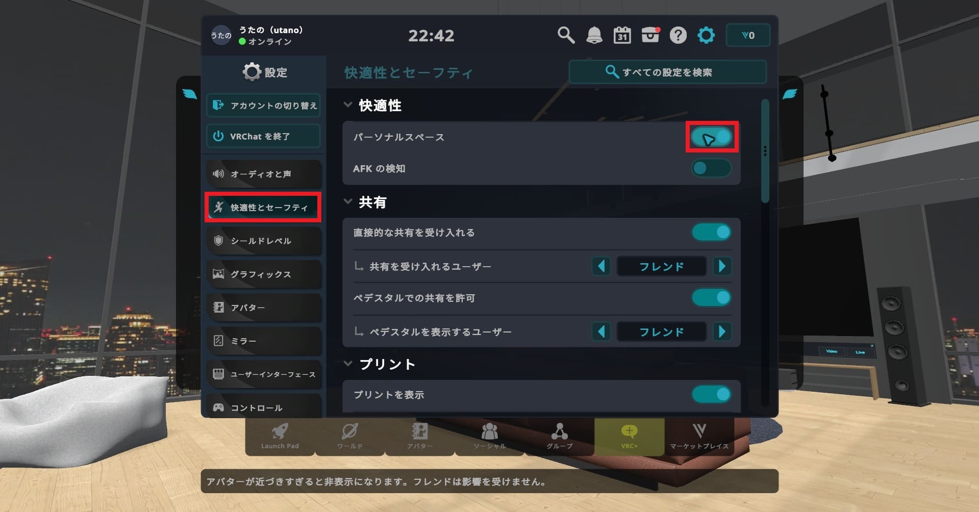 ②左側の「快適性とセーフティ」を選択して、右側にある「パーソナルスペース」をOFFに切り替える。