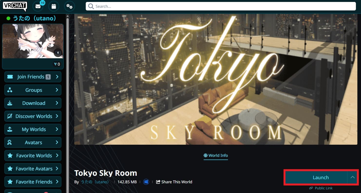 ③VRChatが起動していなければ「Launch World」をクリックすると、VRChatが起動し直接ワールドへ入場できます。起動済みの場合は「Invite Me」をクリックすると、ワールドへの招待が届きます。