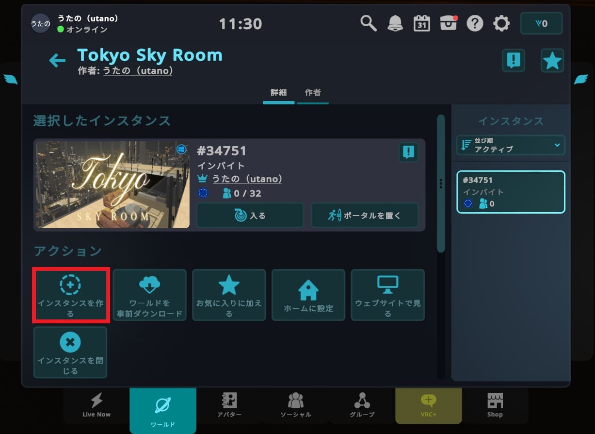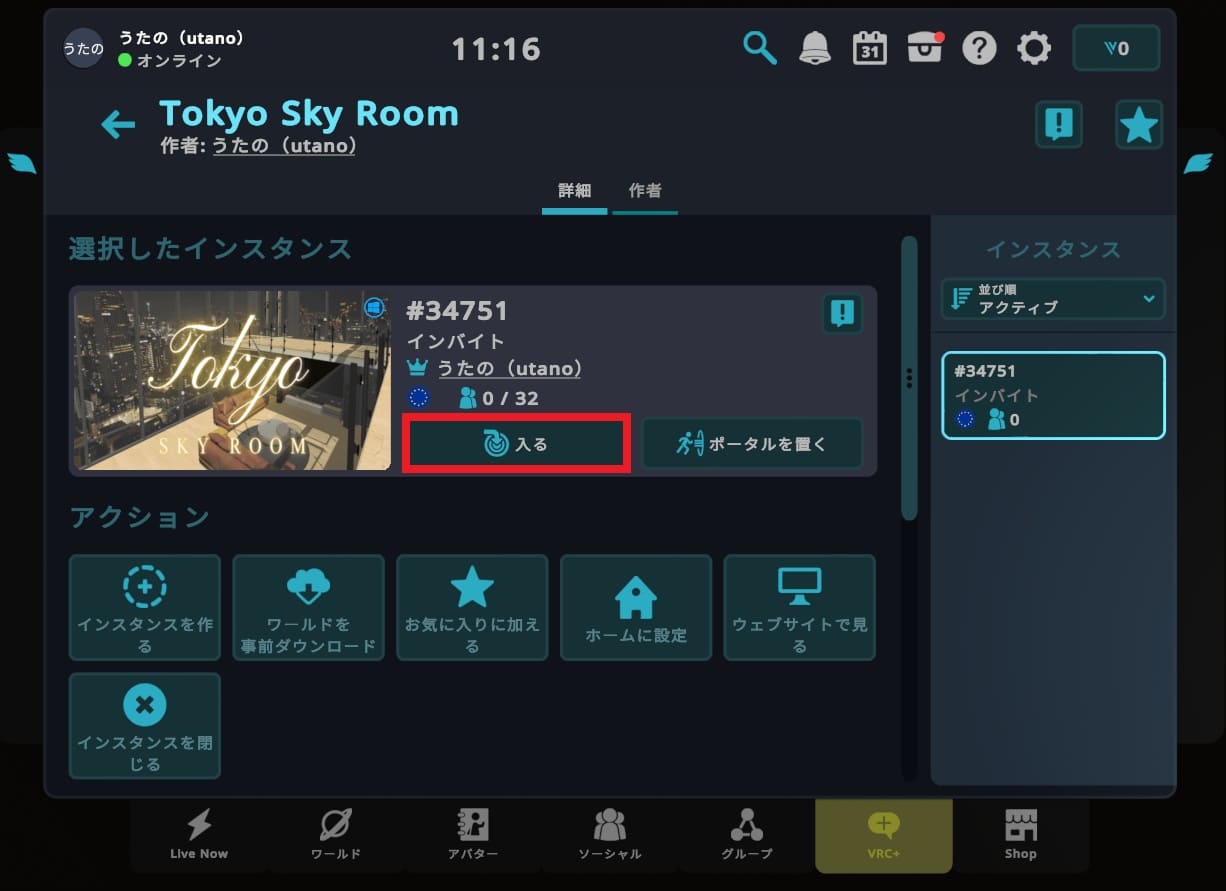同じワールドでも、その中にはいくつもの「部屋」が存在しています。これをVRChatでは「インスタンス」と呼びます。ワールド詳細画面の下の方にズラッと並んでいるのがそれですね。
