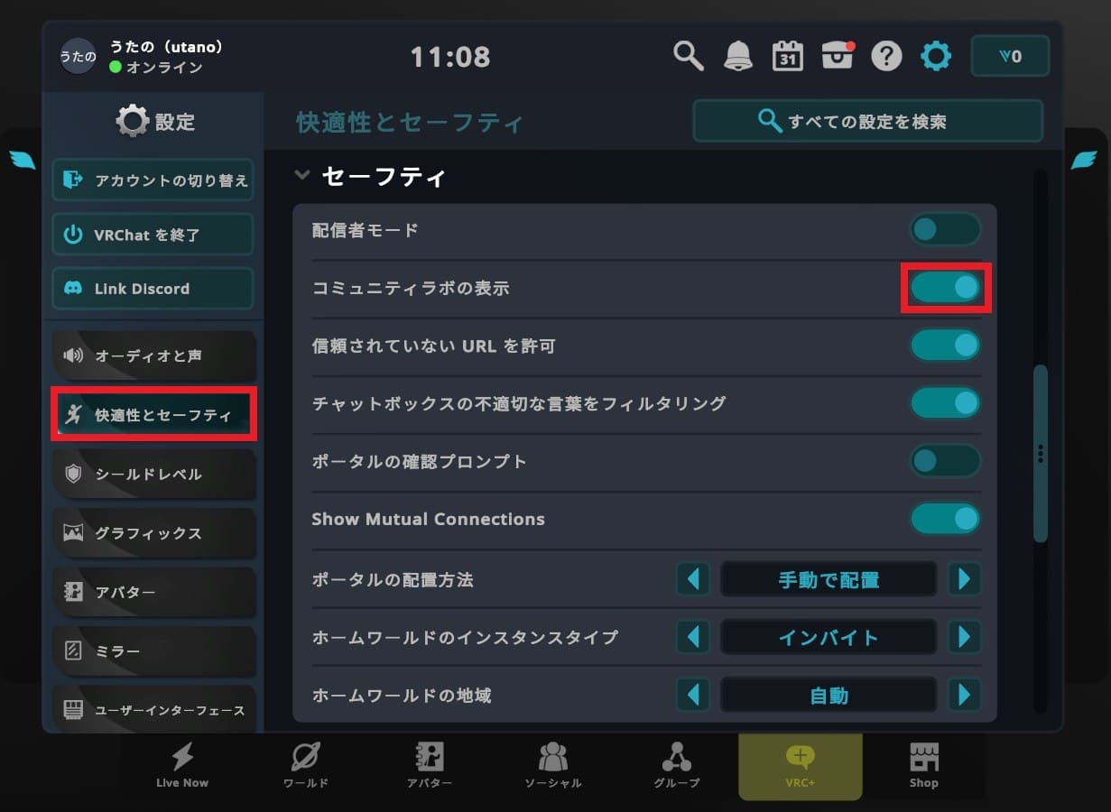 これを解決するには、メニューの「快適性とセーフティ」タブ内で「コミュニティラボの表示」という項目にチェックを入れる必要があります。